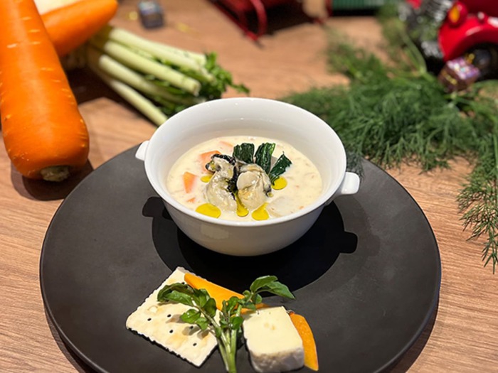旬のクリーミーな牡蠣と群馬県産の新鮮地元野菜を煮込んだとってもミルキーなクラムチャウダーに仕上がりました♪