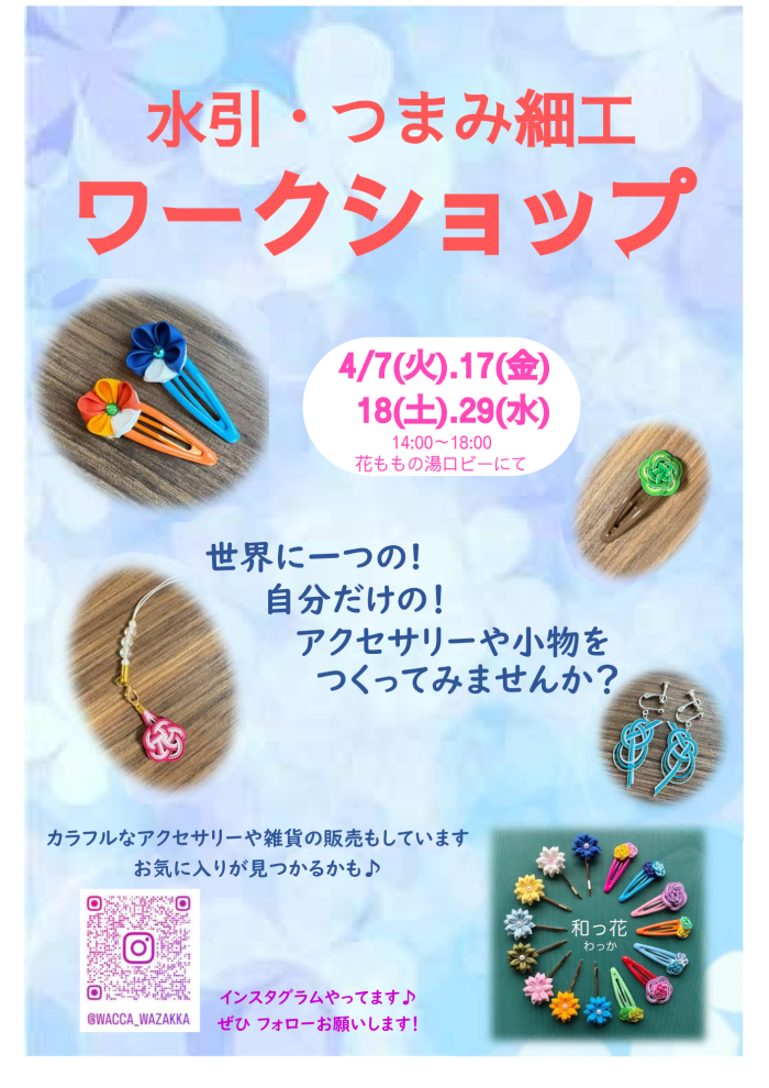 4/7(火)、4/17(金)、4/18(土)、4/29(水・祝)14時~18時に花ももロビーで水引アクセサリー作り体験を開催!