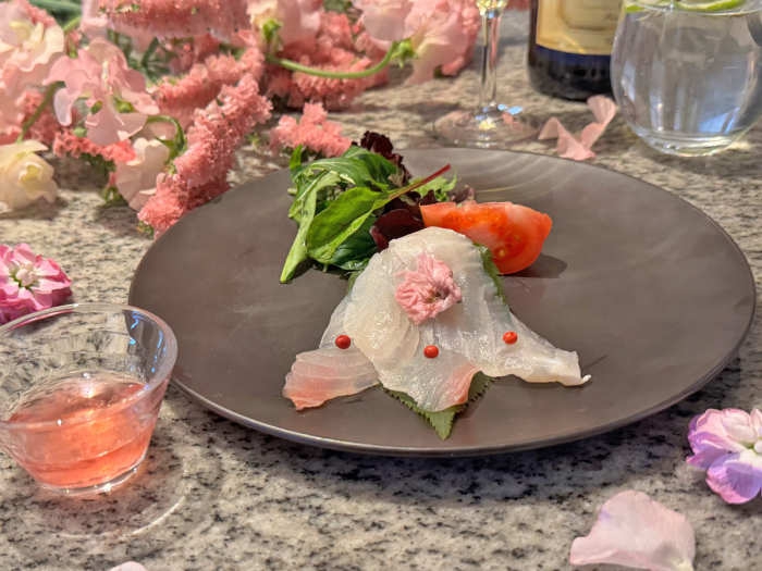 塩漬けの桜の香りをほのかにまとわせ、繊細な塩味で引き立てられた鯛のカルパッチョ♪