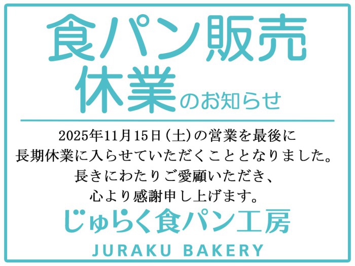 この度「じゅらく食パン工房」は、諸般の事情により、2025年11月15日の営業を最後に、翌11月16…