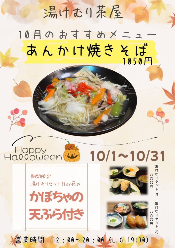 9/16~10/31のハロウィン期間中に《湯けむりセット月 or 花》を注文すると、特別にかぼちゃの天ぷらが付いてくるよ★