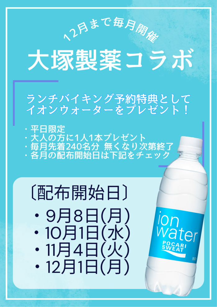 ランチバイキングのご予約特典としてイオンウォーターをプレゼント☆