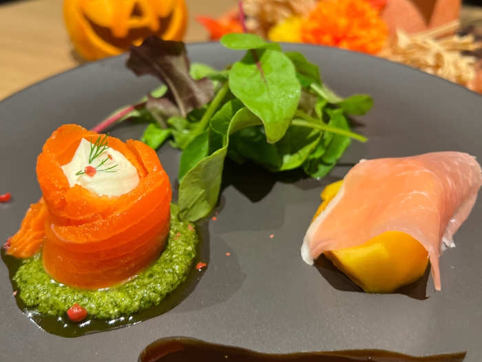 10月は【群馬県産 ホタカサーモンのサワークリームロール&柿の生ハム包み~バジルソース・バルサミコクリーム添え】