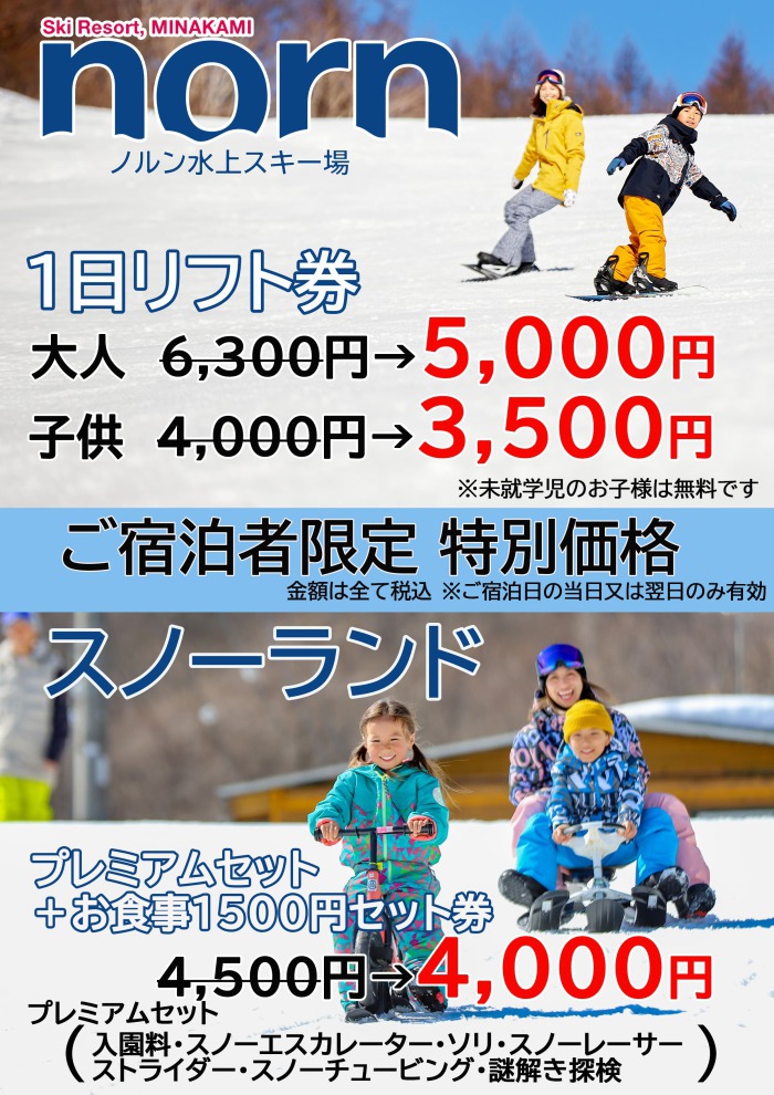 ご宿泊者限定「ノルンみなかみスキー場・1日リフト券」「スノーランド プレミアムチケット」を、おみやげマルシェにて販売中です